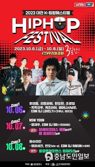 (충남도민일보) 대전시는 새로운 힙합문화 선도 도시 구축과 원도심 경제 활성화를 위해 오는 6일부터 3일간 ‘2023 대전 K-힙합페스티벌’을 대흥동 우리들공원 일원에서 개최한다.