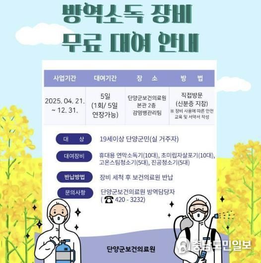 (충남도민일보(도민방송) 임경희기자) 단양군보건의료원은 최근 기온 상승에 따른 해충 확산 우려에 대응하고, 해충 매개 감염병을 예방하기 위해 방역소독 장비 무료 대여 서비스를 실시한다고 밝혔다.