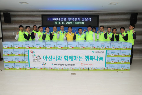 한편, KEB하나은행 충남북영업본부는 평소 행복상자 지원뿐만 아니라 찾아가는 어린이 경제뮤지컬 공연 지원, 아산시건강가정·다문화가족지원센터 지원 및 독거노인 주거환경개선 봉사, 김장김치 봉사활동 등 다양한 사회공헌활동을 꾸준히 실시하고 있다.