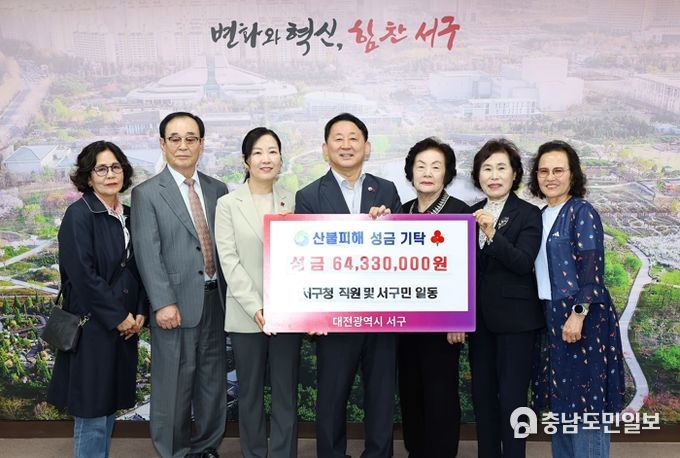 (충남도민일보(도민방송) 김천호기자) 대전 서구는 지난 9일 구청 갑천누리실에서 영남 지역 산불 피해 복구를 위해 모금한 성금 6,433만 원을 대전사회복지공동모금회에 전달하는 기탁식을 개최했다.