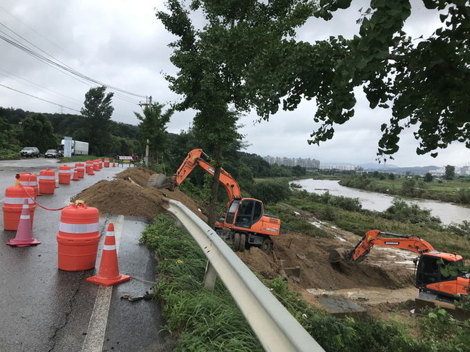 특히, 도로 유실 및 붕괴 지역에 굴삭기15대, 덤프10대를 투입하여 총 30개소 중 22개소를 응급복구 완료하였으며, 도로상에 유출된 토사 제거를 위해 스키로더 6대, 살수차 6대를 투입하였고 도로배수에 지장이 있는 지역에 준설차 4대를 투입했다.