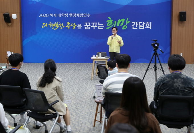 양승조 지사와 행정체험 연수 대학생 등 100여 명이 참석한 가운데 연 이번 행사는 영상 시청, 정책 제안 발표, 강평 등의 순으로 진행했다.