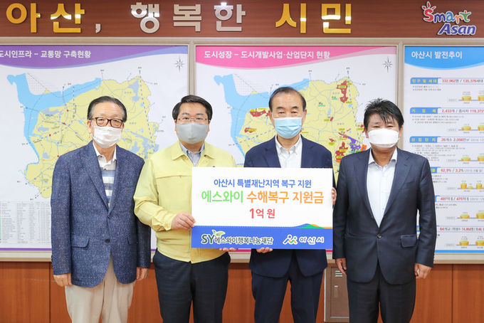전달식에 참석한 홍영돈 에스와이그룹 회장은 “특별재난지역으로 선포된 아산시의 수해복구에 조금이나마 보탬이 되길 바란다”며 “피해주민들의 주거안정을 위한 재난구호주택이나 급속시공이 가능한 조립식주택 등 그룹차원에서 지원이 가능한 사항에 대해서도 적극 검토해보겠다”고 말했다.