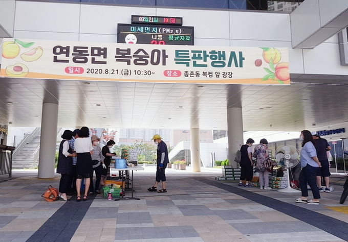 이번 행사는 코로나19 장기화로 판로확보에 어려움을 겪고 있는 연동면 복숭아 재배농가를 돕고, 종촌동 주민들에게는 신선한 복숭아를 저렴하게 구입할 수 있는 기회를 제공하기 위해 마련됐다.