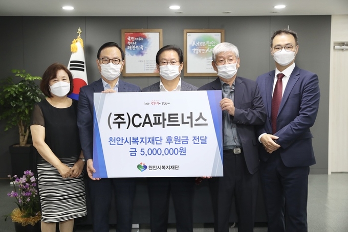 [천안=충남도민일보]한만태기자/ 주식회사 CA파트너스(회장 박종민)가 지난 21일 천안시 적십자 무료급식소 지원을 위한 500만원 후원금 전달식을 천안시청에서 진행했다.