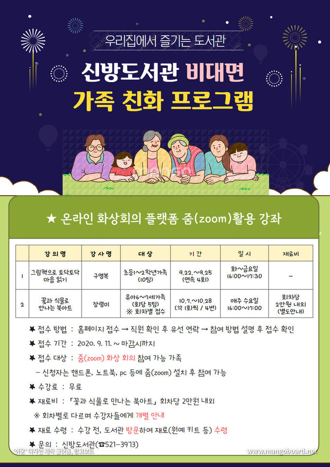 박상임 중앙도서관장은 “이번 프로그램이 코로나19로 지친 마음을 위로하고 가족 간의 마음을 나눌 수 있는 힐링의 시간이 되길 바란다”고 밝혔다.