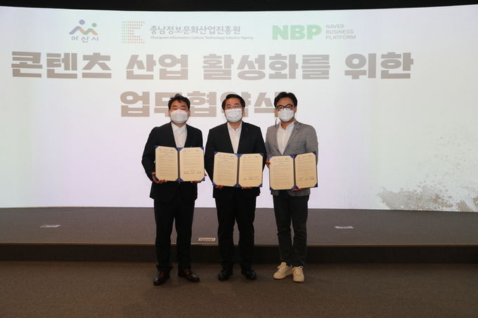 [아산=충남도민일보]정연호기자/ 아산시(시장 오세현)와 충남정보문화산업진흥원(원장 맹창호, 이하 진흥원)의 충남글로벌게임센터, 네이버비즈니스플랫폼(대표 박원기, 이하 NBP)이 아산 지역 게임 산업 활성화를 위한 게임 인프라 기반 확충 업무협약을 맺었다.