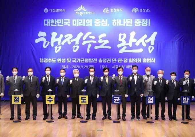 대전·세종·충북·충남 4개 시·도 주민 대표, 시장·도지사, 시·도의회 의장, 지역 국회의원 등 20명으로 구성된 ‘행정수도 완성 및 국가균형발전 충청권 민·관·정 협의회(이하 충청민관정)’가 28일 출범식을 갖고 본격 활동에 돌입했다.