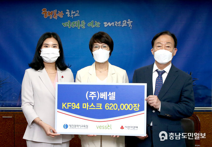 [대전=충남도민일보] 대전광역시교육청(교육감 설동호)은 9일 ㈜베셀(대표이사 이항주)로부터 코로나19 예방을 위한 KF94 마스크 620,000장(4억원 상당)를 기탁받았다고 밝혔다.