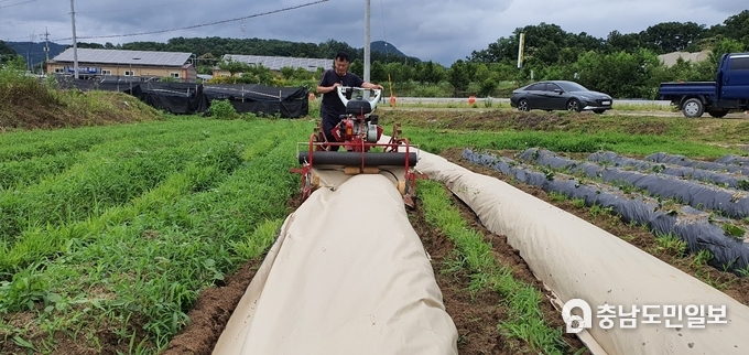 [충남=충남도민일보] (주)에이스멀치(대표 최현황)은 지난 17일 충북 옥천읍 매화리에 있는 연구시험농장에서 이양기 멀칭작업을 실시했다.