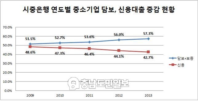 김의원(정무위원회)이 금융감독원으로 부터 제출받은 “중소기업 대출 관련” 자료에 의하면 시중은행의 중소기업 담보대출 비중은 지속적으로 증가하고 있으며, 신용대출은 감소세가 심화되고 있다고 강조했다.