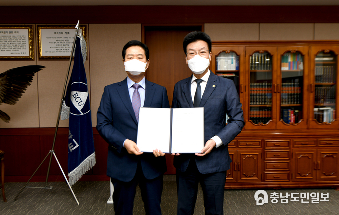 [천안=충남도민일보] 백석문화대학교(총장 송기신)는 29일 오전 11시 30분, 교내 자유관 2층 총장실에서 ㈜대교산업과 산학협력 협약을 체결했다.