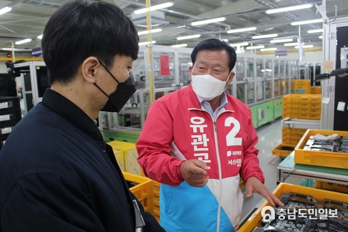 [서산=충남도민일보] 국민의힘 유관곤 서산시장 예비후보는 22일 서산시 지곡면에 위치한 자동차부품생산 기업체를 방문해 현장의 목소리를 청취하고 “위기의 서산경제를 살려내겠다”고 피력했다.