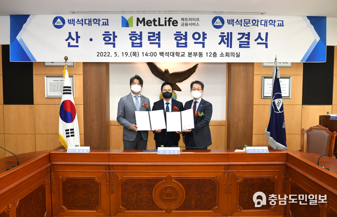 [천안=충남도민일보] 백석대학교(총장 장종현)ㆍ백석문화대학교(총장 송기신)는 19일 오후 2시, 교내 본부동 12층 소회의실에서 메트라이프금융서비스(주)와 산학협력협약을 체결했다.