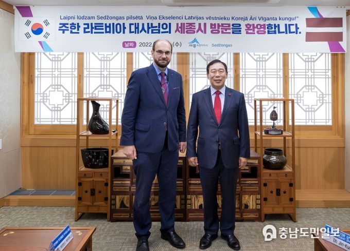 (세종=충남도민일보) 최민호 세종특별자치시장이 지난 28일 시청 접견실에서 아리스 비간츠(Aris Vigants) 주한 라트비아 대사와 만나 세종시-라트비아 간 우호증진과 경제, 문화 분야 협력강화 방안을 논의했다.