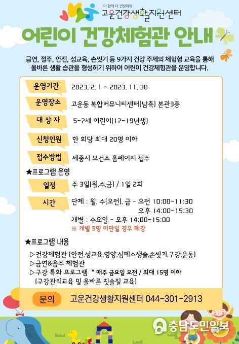 (세종=충남도민일보) 세종특별자치시보건소가 아동들의 건강한 성장을 돕기 위해 이달부터 11월까지 매주 월·수·금요일 고운건강생활지원센터(고운동 남측복합커뮤니티센터 3층)에서 어린이 건강체험관을 운영한다.