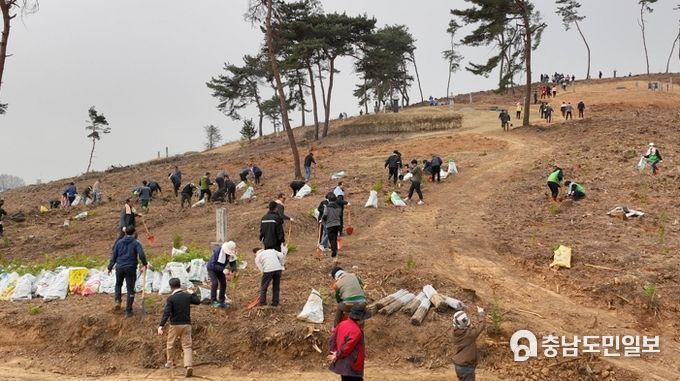 400여 명의 참여자들은 산림공원과ㆍ논산계룡산림조합 등 관계자들의 지도 아래, 한마음으로 나무심기에 나서 구슬땀을 흘렸다.