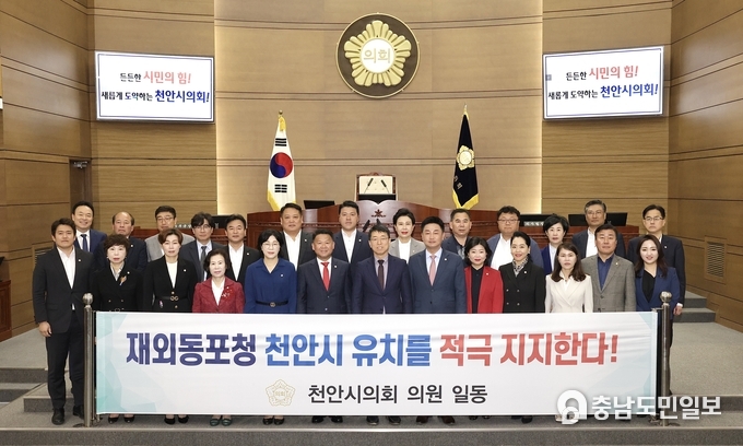천안시의회는 역사적·지리적 당위성을 바탕으로 6월 신설되는 전 세계 193개국 750만 재외동포의 권익을 책임질 ‘재외동포청’의 천안 유치를 강력히 지지 표명하며, 이에 필요한 행정적, 재정적 지원을 다할 것을 결의했다.