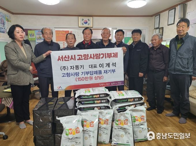 시는 지난 30일 이계석 주식회사 자동기 대표가 고향사랑기부제의 최고 한도액인 500만 원을 기부한 데 이어 지난 6일 150만 원 상당의 서산 쌀과 한우로 된 답례품을 관내 노인시설에 전달했다고 밝혔다.