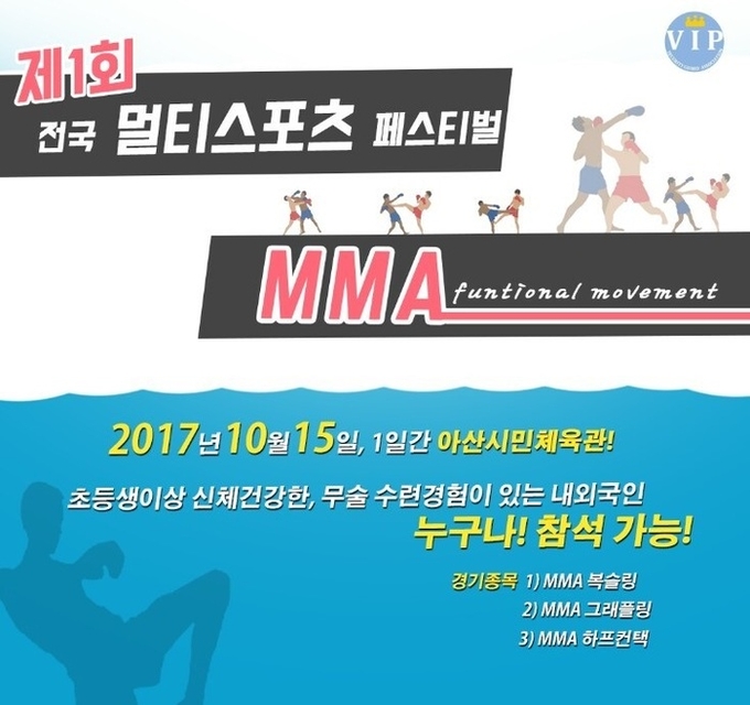 멀티스포츠 연합회(최승필회장)는 10월15일 충남 아산시 아산시민체육관에서 제 1회 전국 MMA 대회를 개최 한다. 격투스포츠는 단순 승패를 가르는 종목이 아닌 종목간 벽을 넘어 다채로움 속에 조화를 이루며 건전하고 폭력이 없는 사회를 만들자는 취지와 새로운 스포츠패러다임을 구축하고자 만들어졌다.