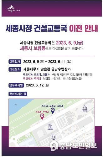 시는 건설교통국을 세종시청 인근 보람동 금강수변상가로 이전하고 오는 12일부터 업무를 개시한다고 7일 밝혔다.