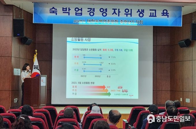 소방서 관계자에 따르면 이번 소방안전교육은 협회에서 실시한 2023년 제1차 숙박경영자 위생교육과 함께 진행된 것으로서 태안소방서 예방총괄팀장 소방경 민효진이 직접 강사로 나섰다고 한다.