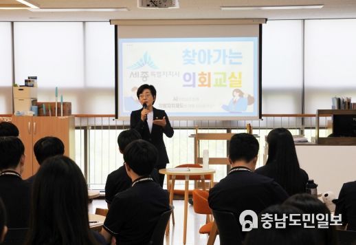 (세종=충남도민일보) 세종특별자치시의회 이순열 의장은 지난 6일 양지중학교 3학년 학생을 대상으로 찾아가는 의회 교실을 운영했다.