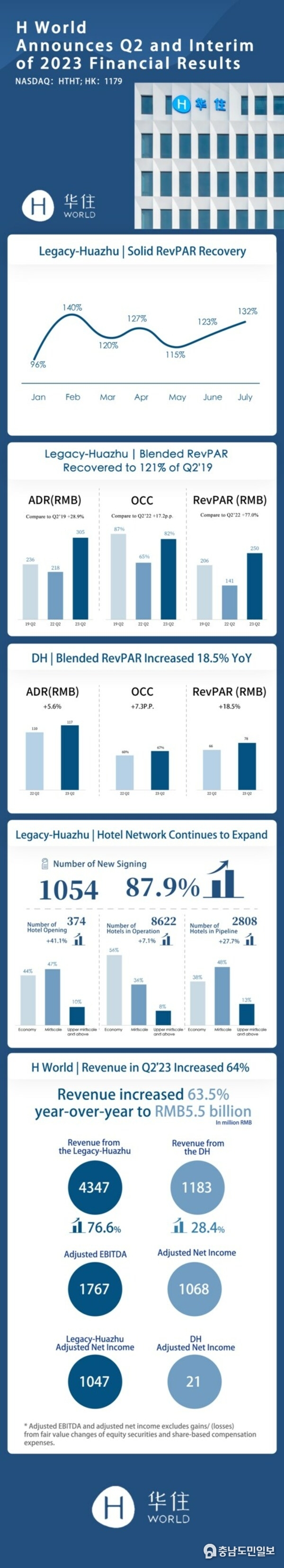 2023년 2분기 H World의 호텔 매출액은 전년 대비 72%나 증가하여 203억 위안을 기록했다. DH를 제외한 2023년 2분기 호텔 매출액은 전년 대비 78.1% 증가했다. 매출은 전년 동기 대비 63.5% 증가한 55억 위안(미화 7억6,200만 달러)에 달했다. Legacy-Huazhu의 매출은 43억 위안으로 전년 대비 76.6% 증가했는데, 이는 확실한 여행 수요 회복과 더불어 Group 지역 본부의 지속적인 상품 업그레이드와 운영 최적화를 통해 얻은 성과이다. Group과 Legacy-Huazhu는 과거 발표된 매출지표를 뛰어넘는 매출 성장을 기록했다. DH 부문 매출은 12억 위안으로 전년 대비 28.4% 증가와 33.5% 연속 증가를 나타낸다. 전년 대비 증가한 것은 주로 Group 사업의 지속적인 회복에 따른 것이고, 연속 증가는 주로 계절적 변동으로 인한 것이다. H World가 거둔 순이익은 10억 위안(미화 1억3,800만 달러)이었고, 2022년 2분기 당기순손실은 3억5000만 위안이었다. 2022년 2분기의 마이너스 2억1300만 위안 및 이전 분기 16억 위안과 비교하여 EBITDA (비GAAP)는 17억 위안(미화 2억 3400만 달러)이었다.