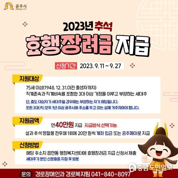(충남도민일보) 공주시는 고령화에 따른 사회문제를 해결하고 지역사회 효 문화 확산을 위해 추석 명절 ‘효행장려금’을 지급한다고 5일 밝혔다.