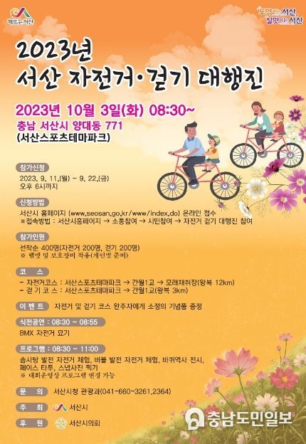 (서산=충남도민일보) 2023년 서산 자전거‧걷기 대행진이 10월 3일 서산스포츠테마파크(양대동 771번지 일원)에서 개최된다.