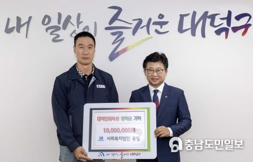 (충남도민일보) 대전 대덕구는 사회복지법인 동일으로부터 대덕인재육성 장학금 1000만원을 기탁받았다고 밝혔다.