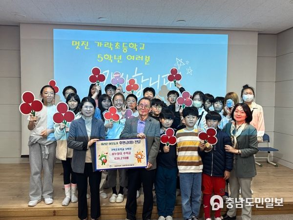 (세종=충남도민일보) 가락초등학교 5학년 학생들은 11월 2일에 고운동행정복지센터에 이웃사랑 성금 636,210원을 전달했다.