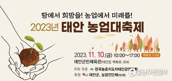 한국농촌지도자 태안군연합회 주관으로 치러지는 이번 축제는 올 한해 많은 노력을 기울인 관내 농업인들을 격려하고 태안 농업에 대한 군민 관심도를 높이기 위한 것으로, ‘땅에서 희망을!, 농업에서 미래를!’이라는 주제로 진행된다.
