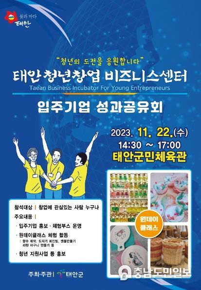 군은 22일 오후 2시 30분부터 태안군민체육관(태안읍 백화로 204)에서 ‘태안청년창업비즈니스센터 성과공유회’를 개최한다고 밝히고 군민들의 많은 관심과 참여를 당부했다.