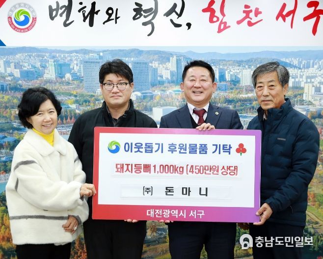 (충남도민일보) 대전 서구(구청장 서철모)는 ㈜돈마니(대표 윤여진)로부터 돼지등뼈 1,000kg(450만 원 상당)을 후원받았다고 1일 밝혔다.