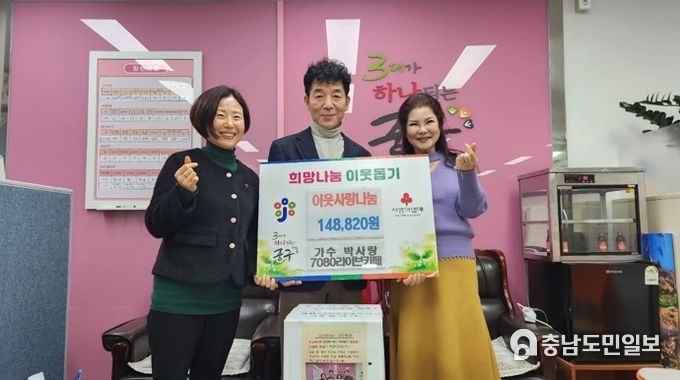 (충남도민일보 / 정호영기자) 대전 중구 부사동은 5일 ‘가수 박사랑 라이브카페’에서 취약계층을 돕기 위한 모금함 성금 148,820원을 기부했다고 밝혔다.