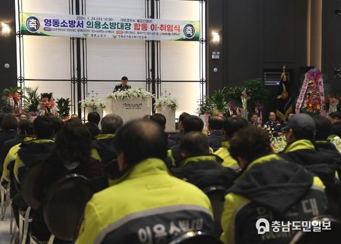 (충남도민일보 / 김천호기자) 영동소방서는 24일 영동읍 매천리 소재 아모르아트웨딩컨벤션에서 영동의용소방대장 합동 이·취임식 행사를 개최했다.