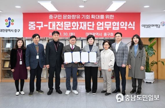 (충남도민일보 / 정호영기자) 대전 중구는 30일 구민의 문화향유 기회 확대에 앞장서고자 대전문화재단과 업무협약을 맺었다고 밝혔다.