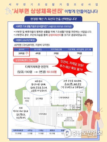 그동안 서부면은 한정된 예산 때문에 상생체육센터 건축(안) 선정에 난항을 겪었다. 2021년에 서부면 기초생활거점조성사업이 총사업비 40억 원으로 확정되면서 당초 상생체육센터 내 실내체육관 연면적을 190평으로 계획했었으나 정부의 긴축재정과 인건비, 자재값 상승으로 확보한 예산 내에서 실내체육관의 연면적을 축소할 수 밖에 없었다.