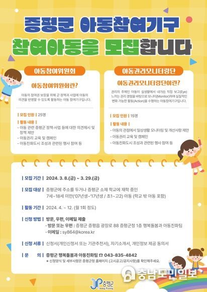 (충남도민일보 / TV / 정호영기자) 충북 증평군이 아동의 권리증진과 참여권 실현을 위해 ‘제5기 아동참여위원회’와 ‘아동권리모니터링단’을 오는 29일까지 모집한다.