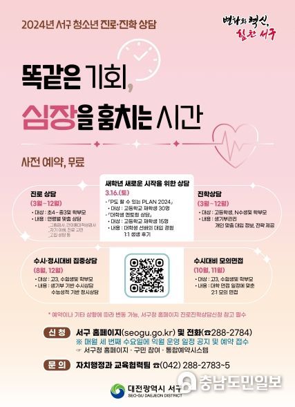 (충남도민일보 / TV / 정호영기자) 대전 서구는 오는 16일 구청 1층 로비에서 중학교 3학년과 고등학교 재학생을 대상으로 맞춤형 대입 정보를 제공하고, 변화하는 입시제도에 발 빠르게 대처할 수 있도록 대규모 진학 상담을 운영한다.