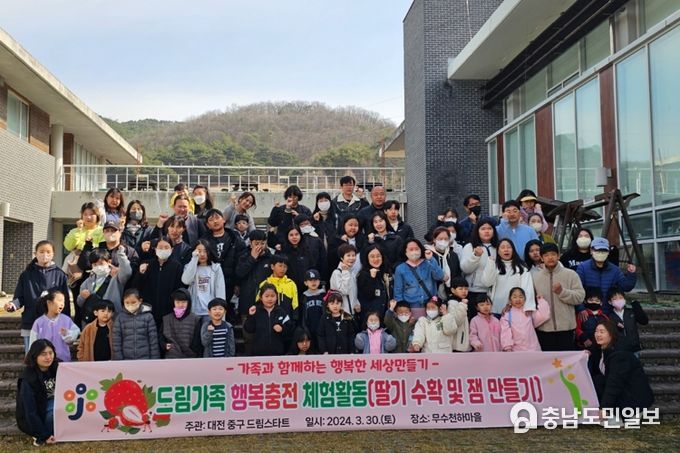 (충남도민일보 / TV / 정호영기자) 대전 중구는 30일 드림스타트 가족 70명과 함께 무수천하마을(중구 무수동)을 방문해 딸기 수확 및 딸기잼 만들기 등 자연체험을 진행했다고 밝혔다.