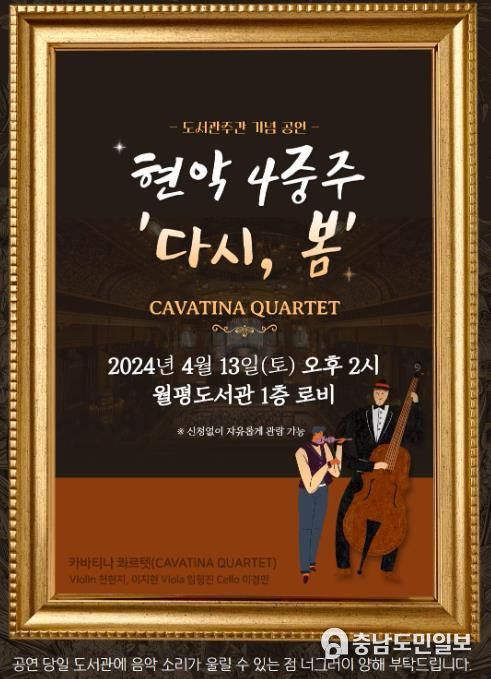 (충남도민일보 / TV / 정호영기자) 대전 서구 월평도서관은 제60회 도서관주간을 맞아 팀 ‘카바티나 콰르텟’이 연주하는 봄맞이 클래식 공연 ‘현악 4중주: 다시 봄’을 운영한다고 8일 밝혔다.