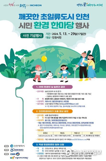 (충남도민일보 / TV / 정호영기자) 인천광역시와 인천환경공단은 제29회 환경의 날을 기념하여 ‘2024 환경을 부탁해!’ 시민참여 공모전을 개최한다.