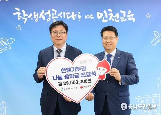 (충남도민일보 / TV / 정호영기자) 인천광역시교육청은 대한적십자사 인천혈액원과 함께 대한민국의 미래를 이끌어 갈 청소년 인재 양성에 기여하는 ‘헌혈기부권 나눔장학금’ 전달식을 14일 교육감실에서 개최했다.