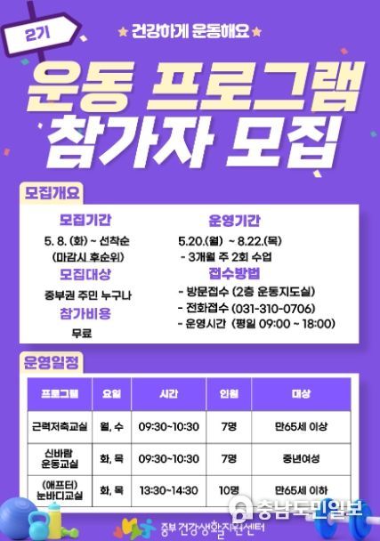 (충남도민일보 / TV / 안희진기자) 시흥시 보건소 중부건강생활지원센터는 중부권 지역주민의 건강관리와 신체활동 활성화를 위해 맞춤형 운동프로그램을 운영하며, 2기 참여자를 5월 13일부터 모집하고 있다.