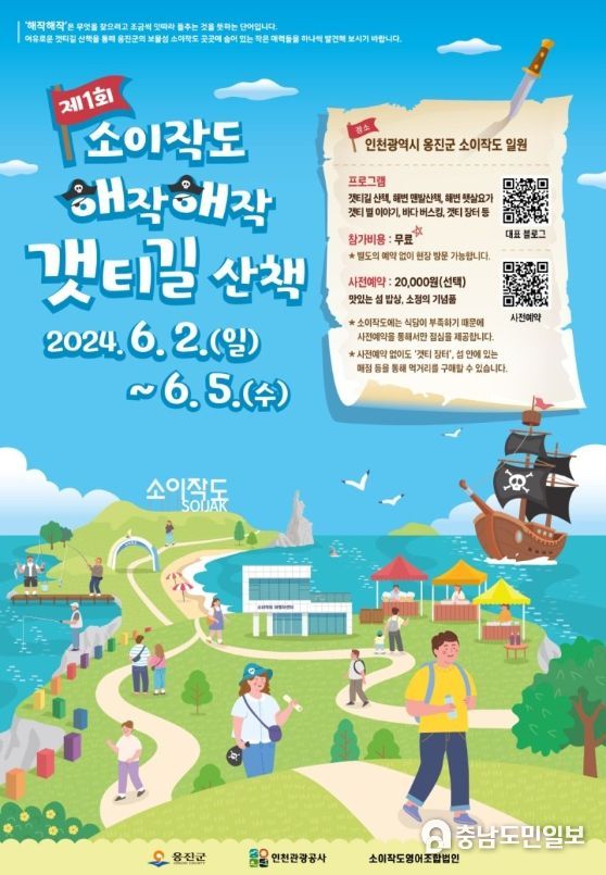 (충남도민일보 / TV / 정호영기자) 옹진군은 옹진군주최, 인천관광공사 주관으로 오는 6월 2일부터 ~ 5일까지 4일 동안, 옹진군 자월면 소이작도에서 갯티길 산책 행사가 개최된다고 밝혔다.