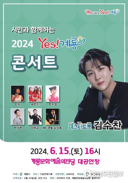 (충남도민일보 / TV / 김천호기자) 계룡시가 오는 6월 15일 오후 4시 계룡문화예술의전당 대공연장에서 ‘시민과 함께하는 2024 Yes! 계룡 콘서트’를 개최한다.