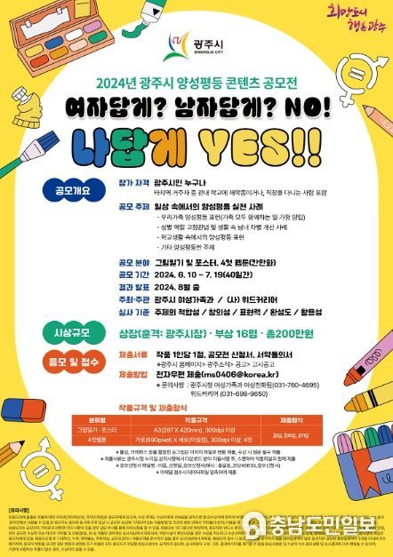 (충남도민일보 / TV / 안희진기자) 광주시는 6월 10일부터 7월 19일까지 40일간 광주시민을 대상으로 일상 속에서의 양성평등 실천 콘텐츠 공모전을 실시한다.