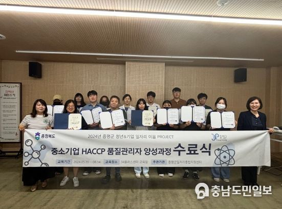 (충남도민일보 / TV / 정호영기자) 충북 증평군은 지난 14일 증평군일자리종합지원센터에서 ‘중소기업 HACCP 품질관리자 양성과정’수료식을 성황리에 마쳤다고 밝혔다.